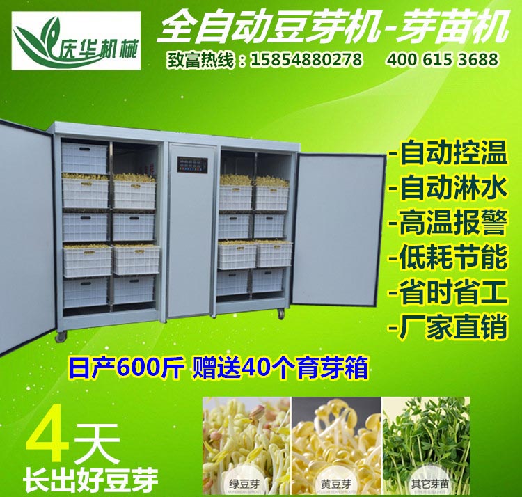 5、豆芽機(jī)產(chǎn)品特點(diǎn): 1)我公司生產(chǎn)的全自動(dòng)綠色無污染豆芽機(jī),是現(xiàn)代技術(shù)與傳統(tǒng)工藝的結(jié)合。豆芽機(jī)通過微電腦自動(dòng)控溫、自動(dòng)加溫、自動(dòng)顯示溫度、自動(dòng)淋水,實(shí)現(xiàn)了生產(chǎn)過程的全自動(dòng)化,具有省時(shí)、省工、低耗、無噪音等特點(diǎn)。 2)用我公司豆芽機(jī)生產(chǎn)的豆芽比傳統(tǒng)手工生產(chǎn)周期短質(zhì)量好,一般手工生產(chǎn)豆芽的周期,夏季需4-5天,冬季需要7-8天,而豆芽機(jī)生產(chǎn)豆芽只要3-4天即可,且不受地理環(huán)境、氣候條件和季節(jié)的影響。 3)我公司豆芽機(jī)生產(chǎn)的豆芽不僅種類多,而且產(chǎn)量高,一斤豆種可生產(chǎn)10斤左右的豆芽。且人工控制的環(huán)境下,豆芽生長均勻一致,潔白鮮嫩、清脆多汁,口感清爽;不僅食用安全、營養(yǎng)豐富,還具有一定的食療保健作用。 4)節(jié)省勞力,操作方便。將浸泡后的豆種放進(jìn)豆芽機(jī)育芽箱內(nèi),就不用管了,它會(huì)自動(dòng)加溫,自動(dòng)淋水,經(jīng)過3-4天時(shí)間就可生產(chǎn)出潔白脆嫩的豆芽。 5)減少爛芽現(xiàn)象。豆芽生長的爛芽現(xiàn)象多發(fā)生在培育后的三天左右,由于手工生產(chǎn)豆芽的周期長,易出現(xiàn)爛芽現(xiàn)象,然而采用豆芽機(jī)生產(chǎn),三天左右豆芽已經(jīng)成熟,可以采收食用,不會(huì)有爛芽現(xiàn)象發(fā)生。